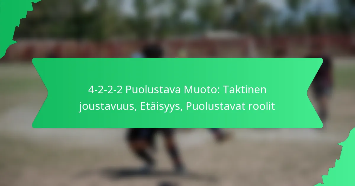4-2-2-2 puolustusmuotoilu on taktinen asettelu jalkapallossa, joka korostaa vahvaa puolustus rakennetta samalla kun se mahdollistaa nopeita siirtymiä hyökkäykseen. Siinä on neljä puolustajaa, kaksi keskikenttäpelaajaa, jotka tarjoavat puolustuksellista tukea, ja kaksi hyökkäävää keskikenttäpelaajaa, jotka tukevat sekä puolustusta että hyökkäystä. Tämä asettelu tarjoaa sekä vakautta että joustavuutta kentällä.
